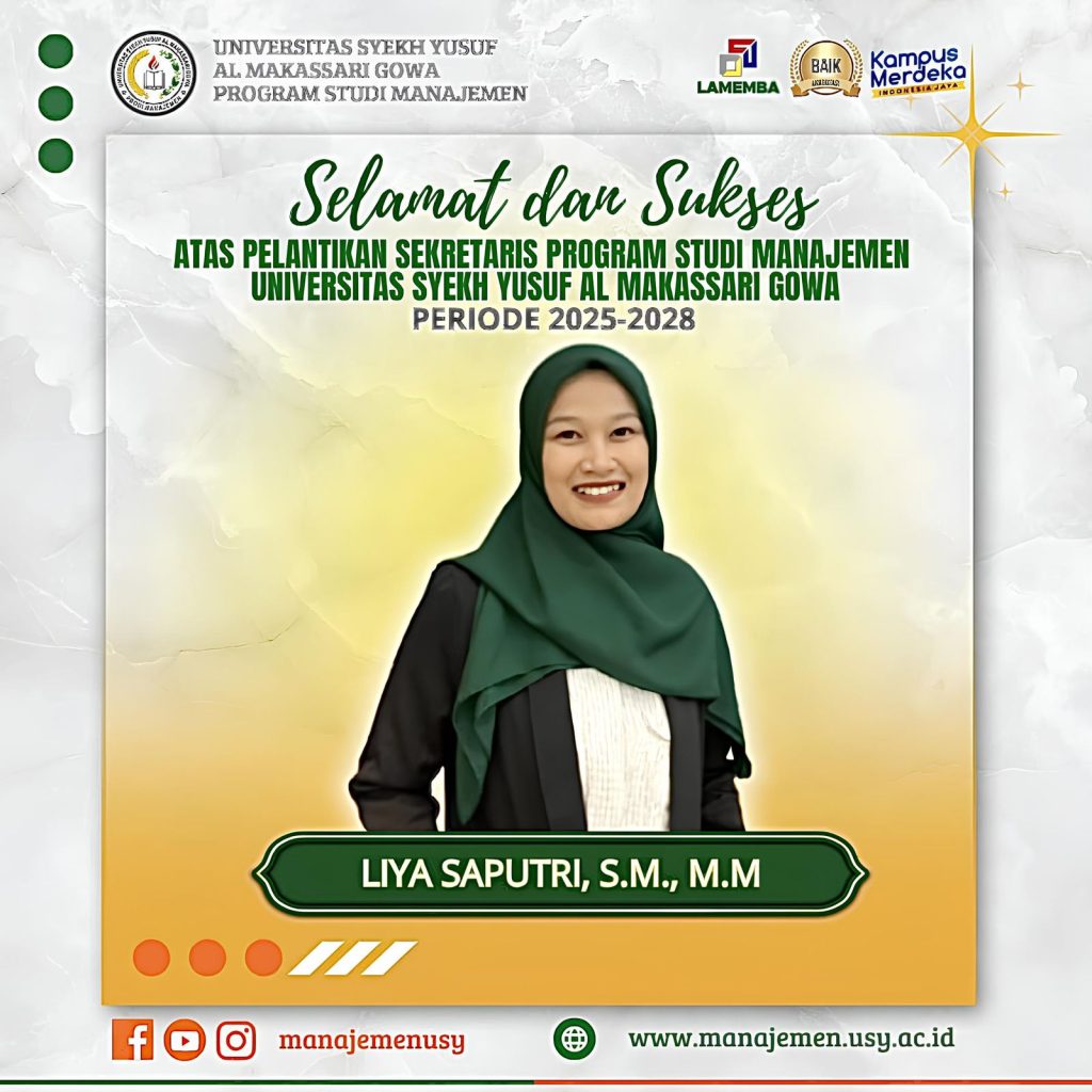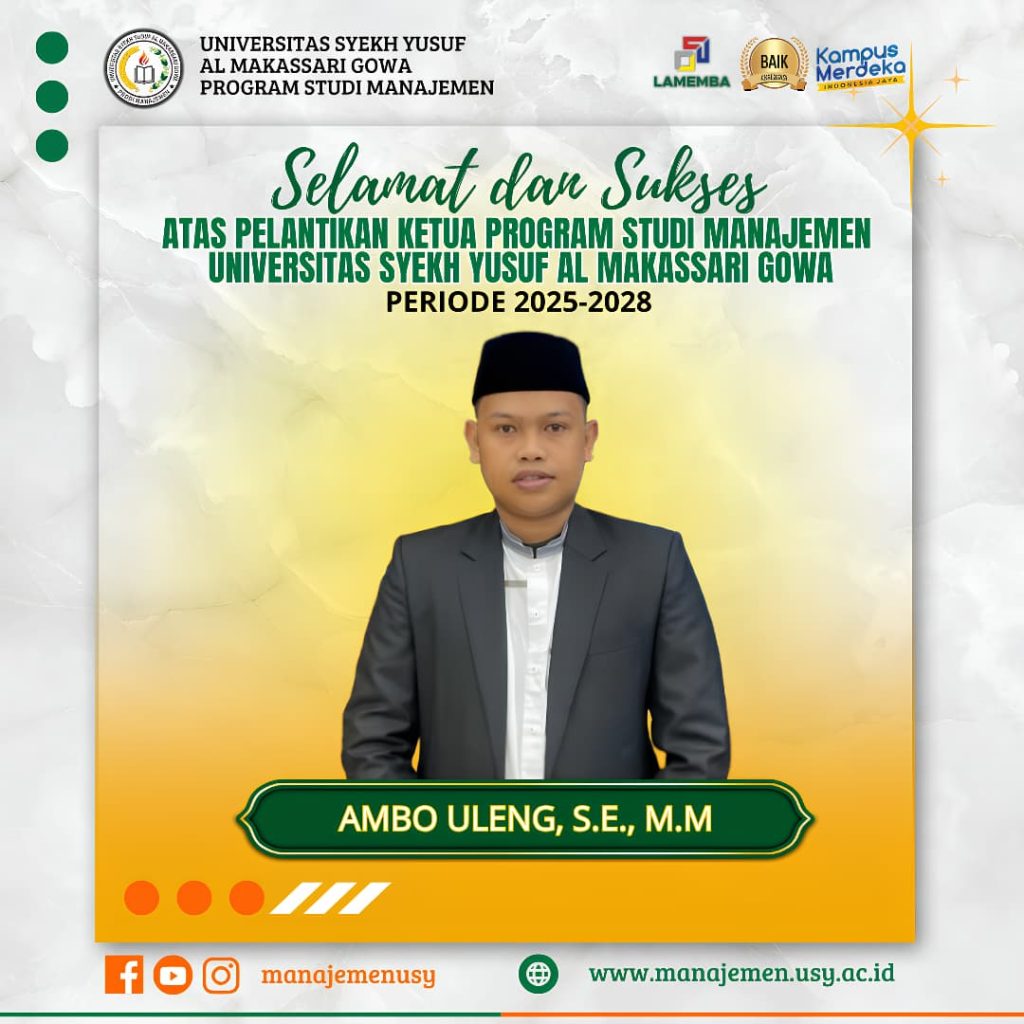 Rektor Universitas Syekh Yusuf Al Makassari (USY) Gowa kembali memberikan amanah kepemimpinan Program Studi Manajemen untuk periode kedua kepada Bapak Ambo Uleng, S.E., M.M. sebagai Ketua Program Studi Manajemen dan Ibu Liya Saputri, S.M., M.M. sebagai Sekretaris Program Studi Manajemen periode 2025–2028. Pelantikan tersebut berlangsung dengan khitmat yang dilaksanakan pada Sabtu, 13 Desember 2025, bertempat di Hotel Remcy, Kota Makassar, dan dipimpin langsung oleh Rektor Universitas Syekh Yusuf Al Makassari Gowa,Dr. Sennahati, S.Sos., M.I.Kom. Pada kegiatan ini terdapat beberapa pejabat struktural lainya yang tergabung dalam prosesi pelantikan ini.